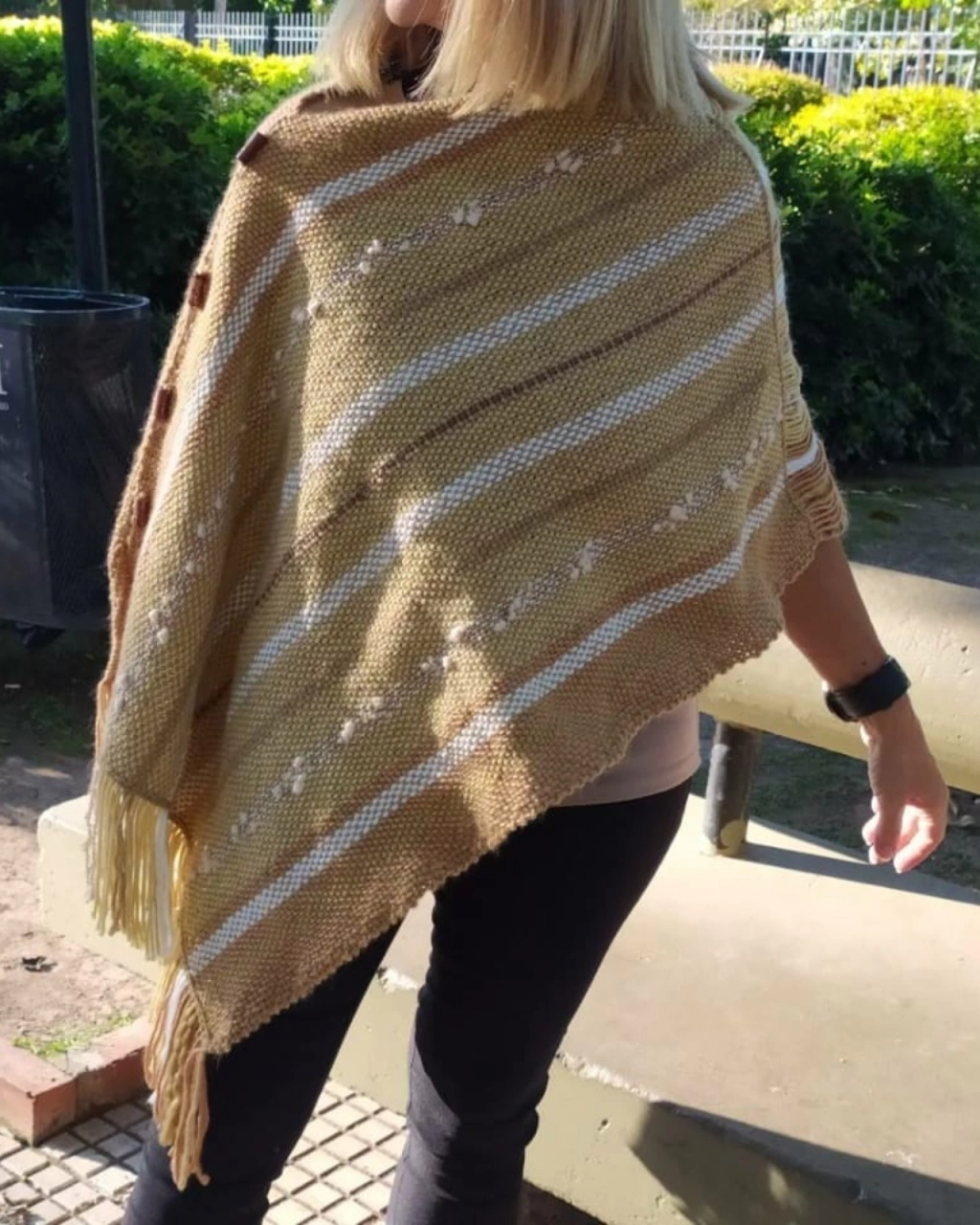 Nuestros ponchos, tejidos en telar con mecha y cashmilon de alta calidad, ofrecen una fusión excepcional de confort y estilo. Este poncho, con tono natural, beige y ocre, presenta un diseño distintivo y botones que emanan sofisticación y modernidad sin la necesidad de bordados.